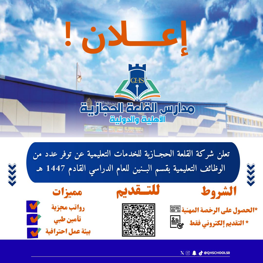 مدارس القلعة الحجازيةتعلن (مدارس القلعة الحجازية الأهلية والدولية) عبر حسابها الرسمي على منصة (إكس) عن توفر وظائف تعليمية شاغرة للرجال فقط، في عدد من التخصصات والمراحل الدراسية للعمل في (المدينة المنورة) استعدادًا للعام الدراسي 1447هـ، وذلك وفقاً للتفاصيل والشروط الآتية.