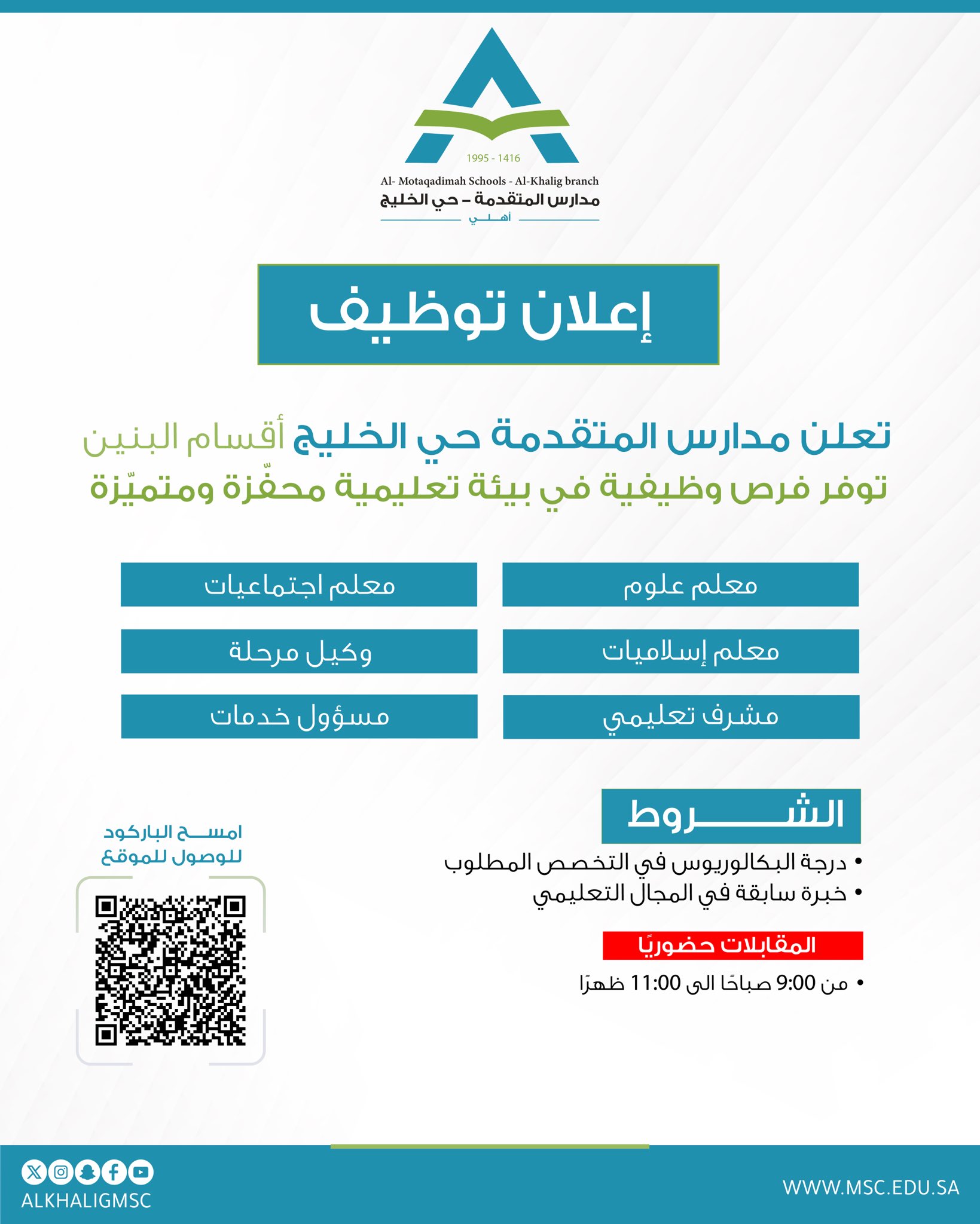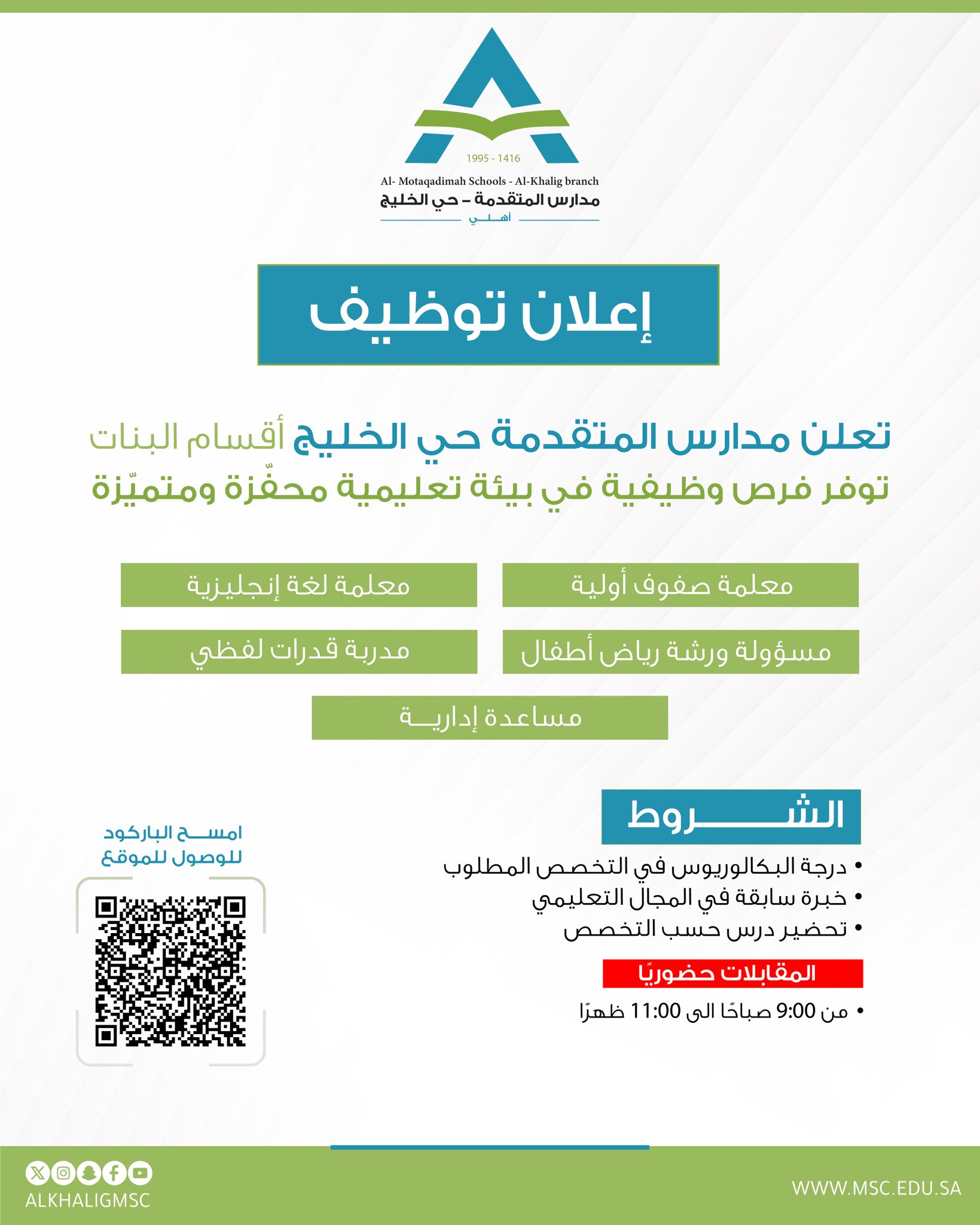 شركة المدارس المتقدمةتعلن (مدارس المتقدمة حي الخليج) عبر حسابها الرسمي على منصة (إكس) عن توفر وظائف تعليمية وإدارية (رجال / نساء) للعام الدراسي القادم 1447هـ، وذلك وفقاً للتفاصيل والشروط الآتية.