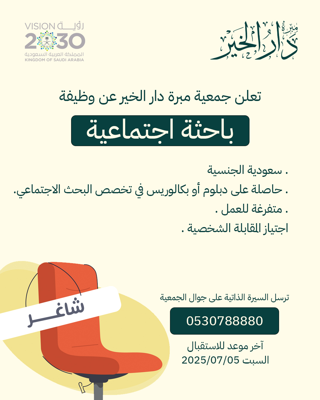 مبرة دار الخيرتعلن (جمعية مبرة دار الخير) عبر حسابها الرسمي على منصة (إكس) عن توفر وظائف شاغرة لحملة الدبلوم فأعلى في تخصص البحث الاجتماعي في الدمام، وذلك وفقاً للتفاصيل والشروط الآتية.
