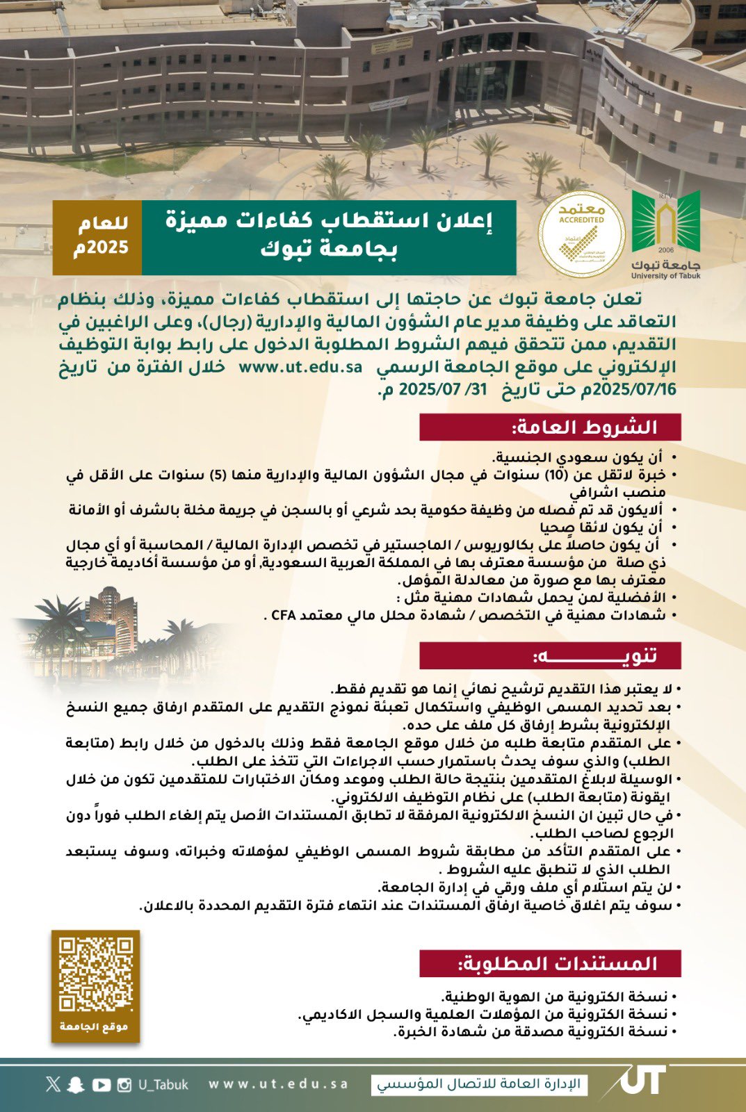 تعلن (جامعة تبوك) عبر حسابها الرسمي على منصة (إكس) عن حاجتها إلى استقطاب كفاءات مميزة، وذلك بنظام التعاقد على وظيفة (مدير عام الشؤون المالية والإدارية) للرجال، وذلك وفقاً للتفاصيل والشروط الآتية.