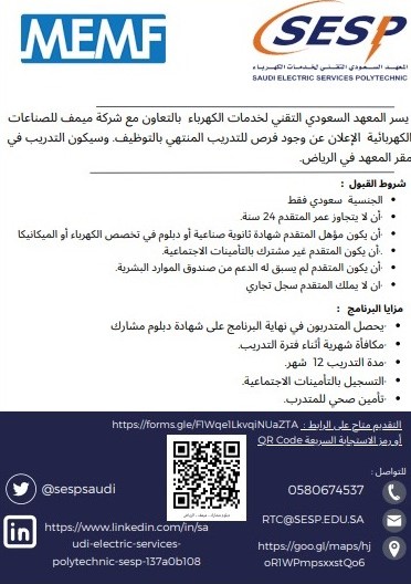 المعهد السعودي التقني لخدمات الكهرباءيعلن (المعهد السعودي التقني لخدمات الكهرباء) عبر حسابه الرسمي على منصة (إكس) بالتعاون مع شركة ميمف للصناعات الكهربائية عن تدريب منتهي بالتوظيف في مقر المعهد بالرياض، وذلك وفقاً للتفاصيل والشروط الآتية.