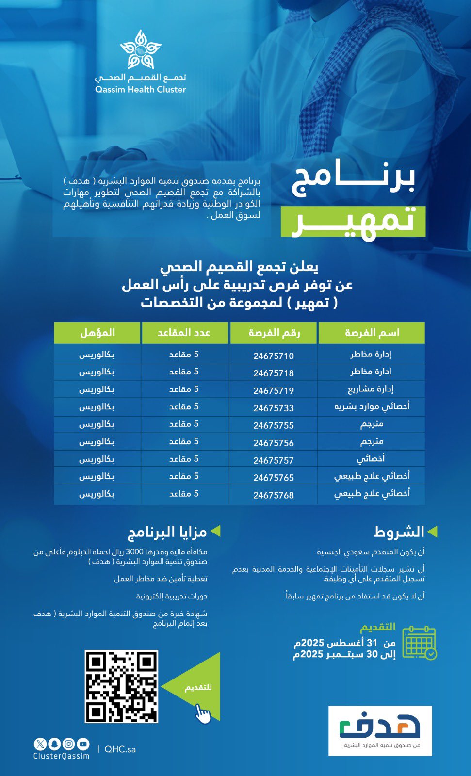 تجمع القصيم الصحييعلن (تجمع القصيم الصحي) عبر حسابها الرسمي على منصة (إكس) عن برنامج التدريب على رأس العمل تمهير في عدد من التخصصات، وذلك وفقاً للتفاصيل والشروط الآتية.