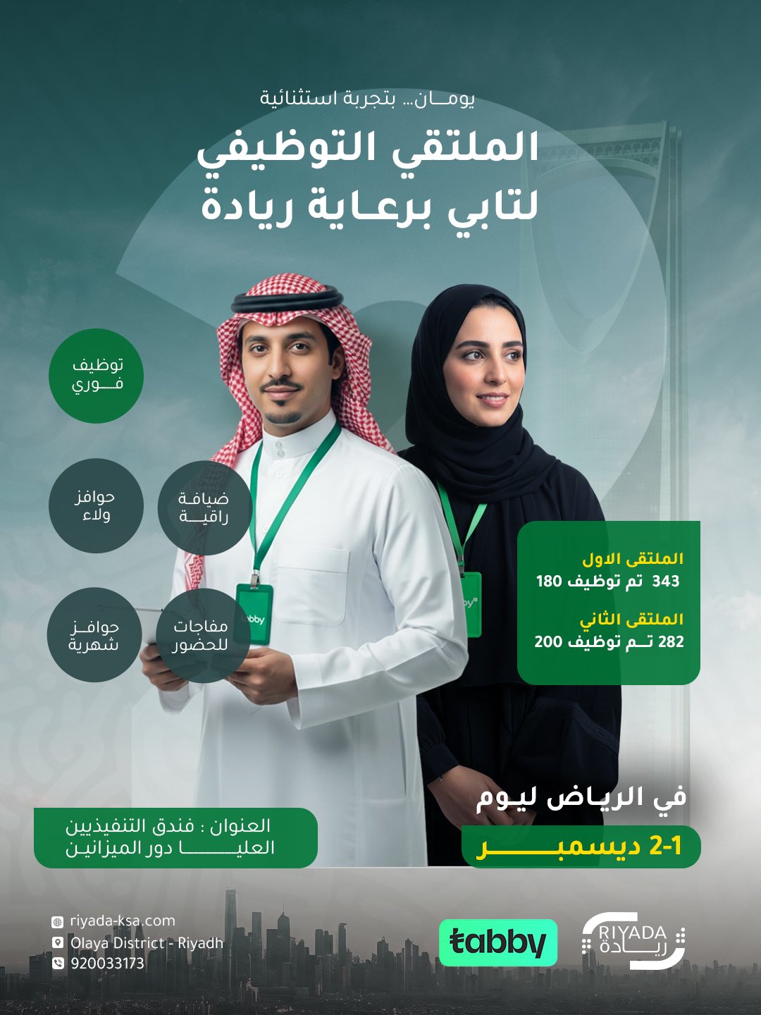 شركة تابي بالتعاون مع ريادة تعلن عن إقامة ملتقى توظيف تابي لحملة مختلف الشهادات توظيف فوري وحوافز شهرية ومزايا عديدة، وذلك وفقاً للتفاصيل والشروط الآتية.