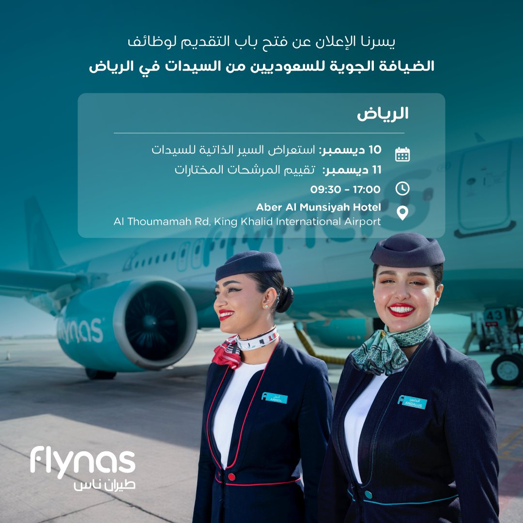 شركة طيران ناس تفتح باب التقديم لوظائف الضيافة الجوية للنساء بالرياض،