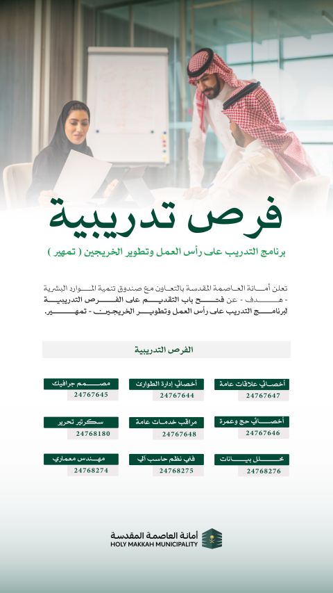 (أمانة العاصمة المقدسة) ممثلة في الإدارة العامة للموارد البشرية - هدف - عن فتح باب التقديم على الفرص التدريبية لبرنامج التدريب على رأس العمل وتطوير الخريجين - تمهير، وذلك من خلال التفاصيل الآتية.