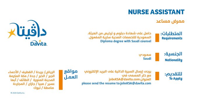 شركة دافيتا تعلن عن فتح باب التوظيف بمجال التمريض في 17 مدينة بالمملكة