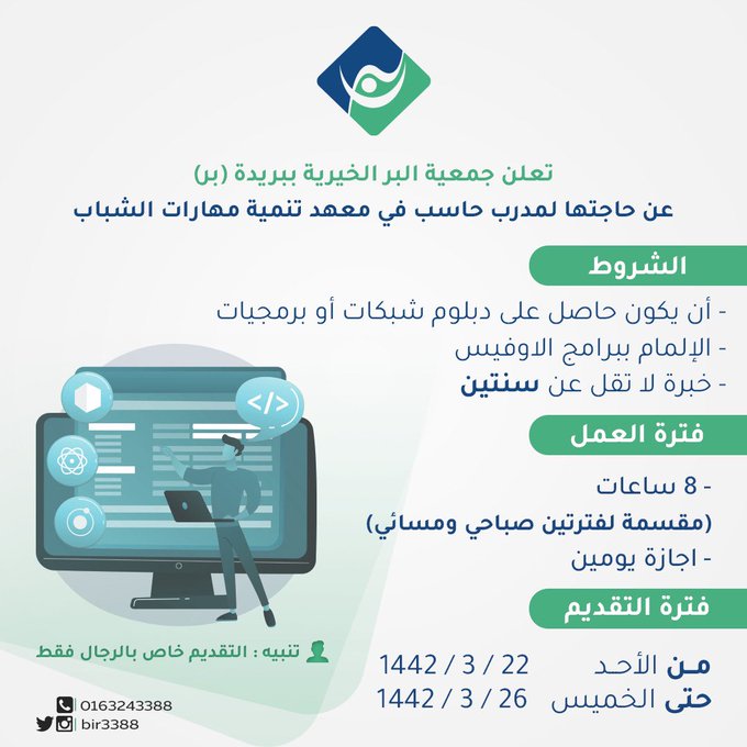 جمعية البر ببريدةتعلن جمعية البر الخيرية ببريدة عن حاجتها لتوظيف مدرب حاسب آلي في معهد تنمية مهارات الشباب ،وذلك من خلال التفاصيل الآتية: