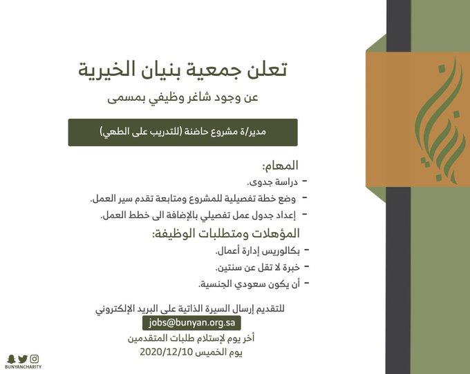 جمعية بنيان الخيريةتعلن (جمعية بنيان الخيرية) عبر حسابها الرسمي على (تويتر) عن توفر وظائف شاغرة بمسمى (مدير/ة مشروع حاضنة ( للتدريب على الطهي)) للعمل في (الرياض)، واشترطت ان يكون المتقدم سعودي الجنسية، وذلك وفقاً للتفاصيل والشروط الآتية.