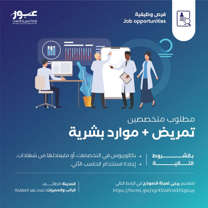 تعلن (شركة تنمية عبور الإنسان) عبر حسابها الرسمي على (تويتر) عن توفر وظائف شاغرة للعمل في (الطائف)، واشترطت ان يكون المتقدم سعودي الجنسية، وذلك وفقاً للتفاصيل والشروط الآتية.