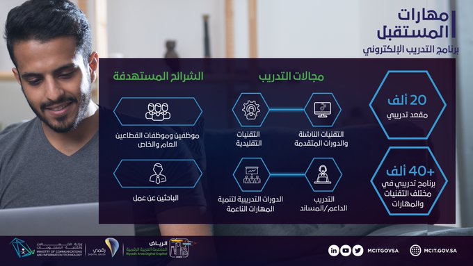وزارة الإتصالات وتقنية المعلومات توفر برنامج تدريب إلكتروني ضمن مبادرة مهارات المستقبل لتدريب الكوادر الوطنية عن بُعد لاكتساب المهارات الرقمية النوعية المطلوبة في سوق العمل ليكونوا جزء فاعل في مسيرة التحول الرقمي، وذلك من خلال التفاصيل الآتية.