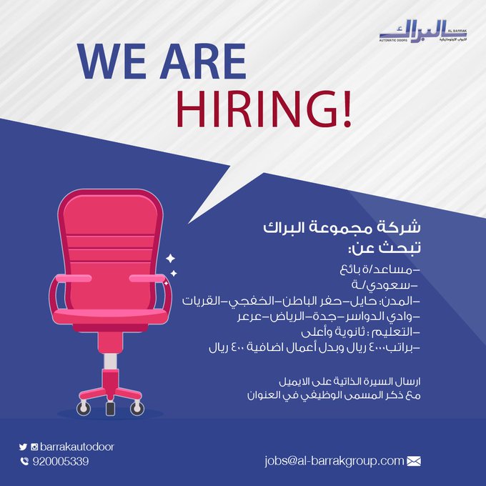 شركة البراك للأبواب الأوتوماتيكيةتعلن (شركة البراك للأبواب الأوتوماتيكية) عبر حسابها الرسمي ( تويتر ) عن توفر وظائف شاغرة بمسمى ( مساعد/ة بائع ) للعمل في (عدة مدن)، واشترطت ان يكون المتقدم سعودي الجنسية، وذلك وفقاً للتفاصيل والشروط الآتية.