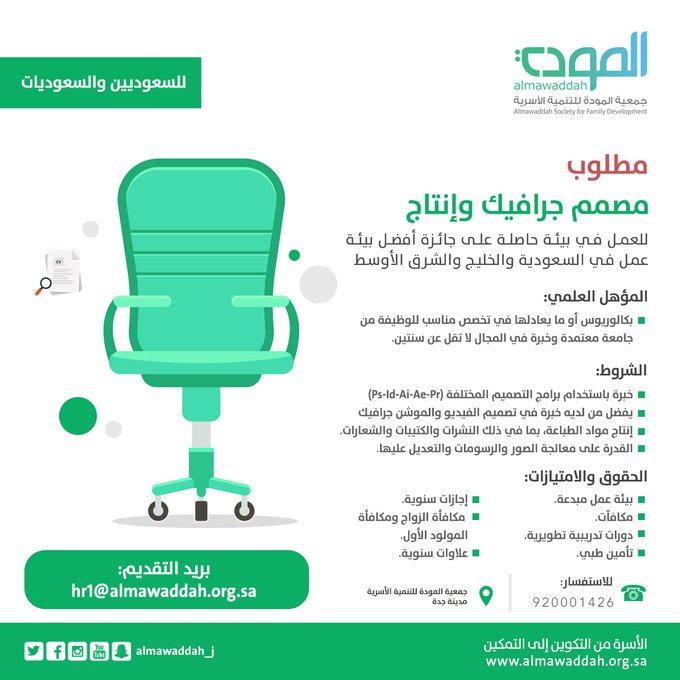 جمعية المودةتعلن (جمعية المودة للتنمية الأسرية) عبر حسابها الرسمي (تويتر) عن توفر وظائف شاغرة بمسمى ( مصمم جرافيك وإنتاج ) للعمل في (جدة)، واشترطت ان يكون المتقدم سعودي الجنسية، وذلك وفقاً للتفاصيل والشروط الآتية.