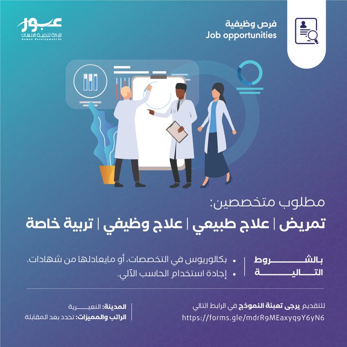 شركة تنمية الإنسان - عبورتعلن (شركة تنمية الإنسان (عبور)) عبر حسابها الرسمي على (تويتر) عن توفر وظائف شاغرة للعمل في (النعيرية)، واشترطت ان يكون المتقدم سعودي الجنسية، وذلك وفقاً للتفاصيل والشروط الآتية.