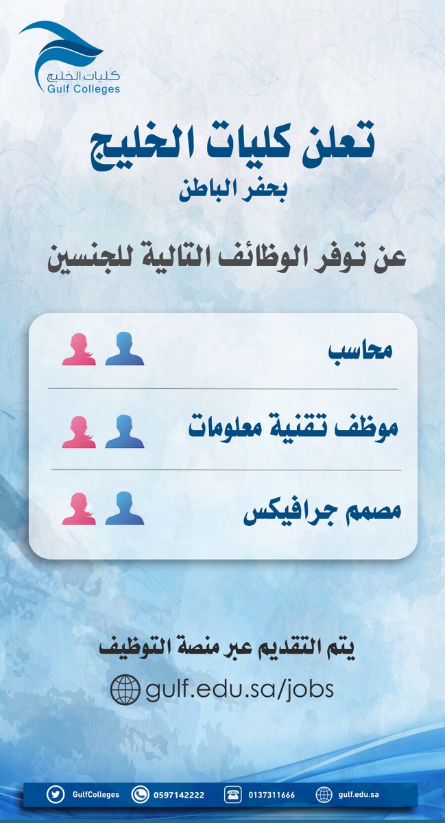 وظيفتك عليناتعلن (كليات الخليج) عبر حسابها الرسمي على (تويتر) عن توفر وظائف شاغرة للعمل في (حفر الباطن)، واشترطت ان يكون المتقدم سعودي الجنسية، وذلك وفقاً للتفاصيل والشروط الآتية.