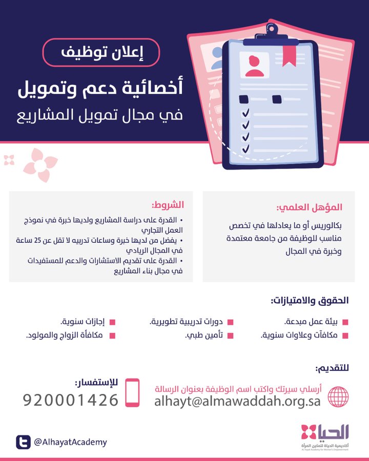 أكاديمية الحياة لتمكين المرأةتعلن (أكاديمية الحياة لتمكين المرأة) عبر حسابها الرسمي على (تويتر) عن توفر وظائف شاغرة بمسمى ( أخصائية دعم وتمويل ) للعمل في (جدة)، واشترطت ان يكون المتقدم سعودي الجنسية، وذلك وفقاً للتفاصيل والشروط الآتية.