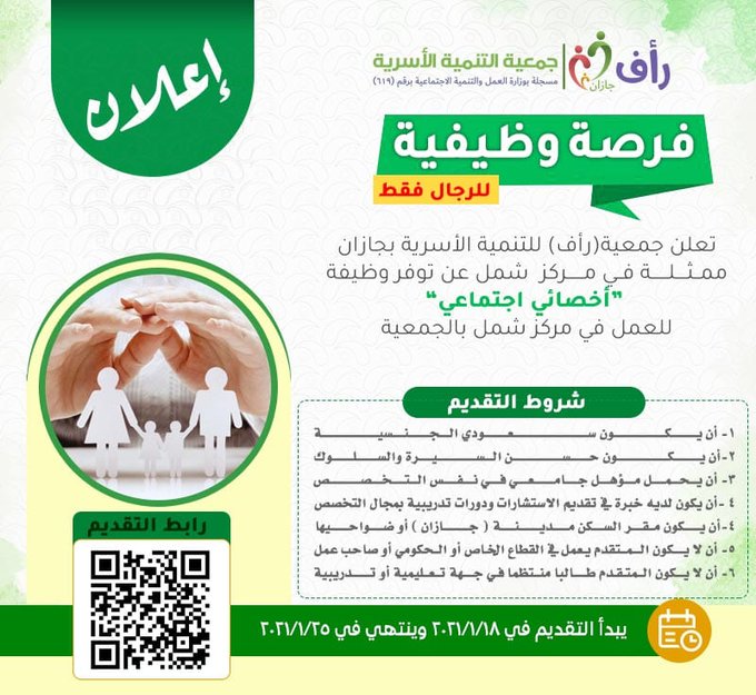 2021-01-21تعلن (جمعية رأف للتنمية الأسرية) ممثلة في مركز شمل عبر حسابها الرسمي على (تويتر) عن توفر وظائف شاغرة بمسمى ( أخصائي اجتماعي) للعمل في (جازان)، واشترطت ان يكون المتقدم سعودي الجنسية، وذلك وفقاً للتفاصيل والشروط الآتية.