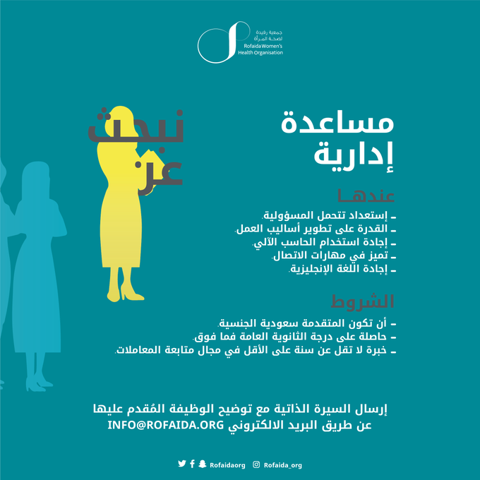 2021-01-23تعلن (جمعية رفيدة لصحة المرأة) عبر حسابها الرسمي على (تويتر) عن توفر وظائف شاغرة بمسمى (مديرة عامة، مساعدة إدارية) للعمل بمدينة (الرياض)، واشترطت ان تكون المتقدمة سعودية الجنسية، وذلك وفقاً للتفاصيل والشروط الآتية.