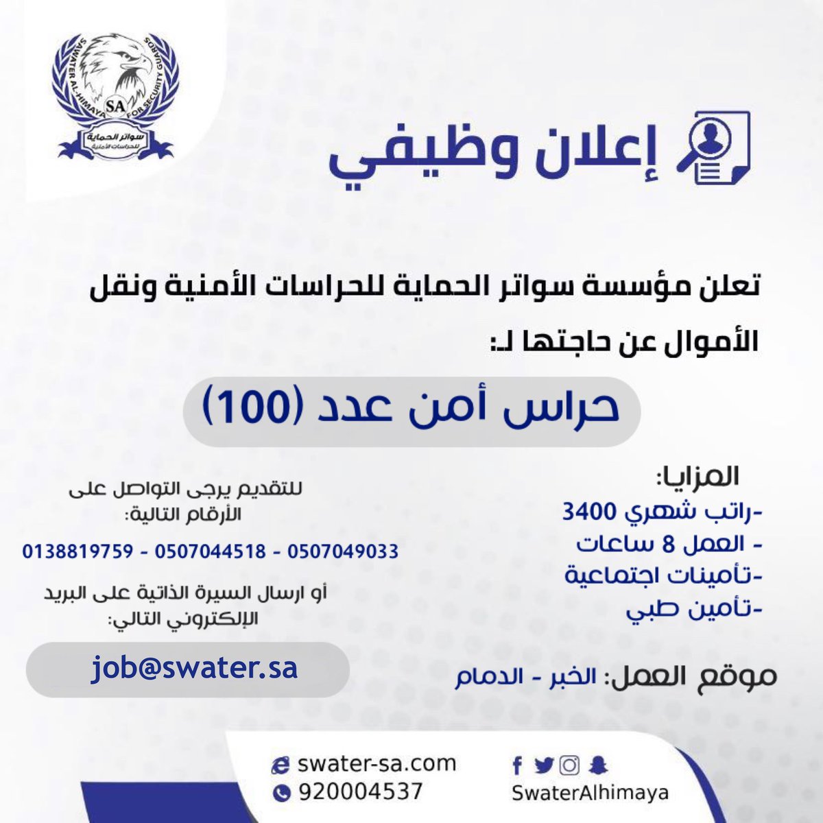 مؤسسة سواتر الحماية للحراسات الأمنيةتعلن (مؤسسة سواتر الحماية للحراسات الأمنية ونقل الأموال) عن توفر وظائف شاغرة بمسمى (حارس أمن، سكرتيرة) للعمل في (الدمام، الخبر، حفر الباطن)، واشترطت ان يكون المتقدم سعودي الجنسية، وذلك وفقاً للتفاصيل والشروط الآتية.