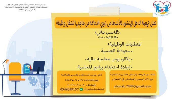 جمعية الأمل المنشود للرعاية النهاريةتعلن ( جمعية الأمل المنشود ) عبر حسابها الرسمي على (تويتر) عن توفر وظائف شاغرة بمسمى ( محاسب مالي ) للعمل في (مكة المكرمة)، واشترطت ان يكون المتقدم سعودي الجنسية، وذلك وفقاً للتفاصيل والشروط الآتية.