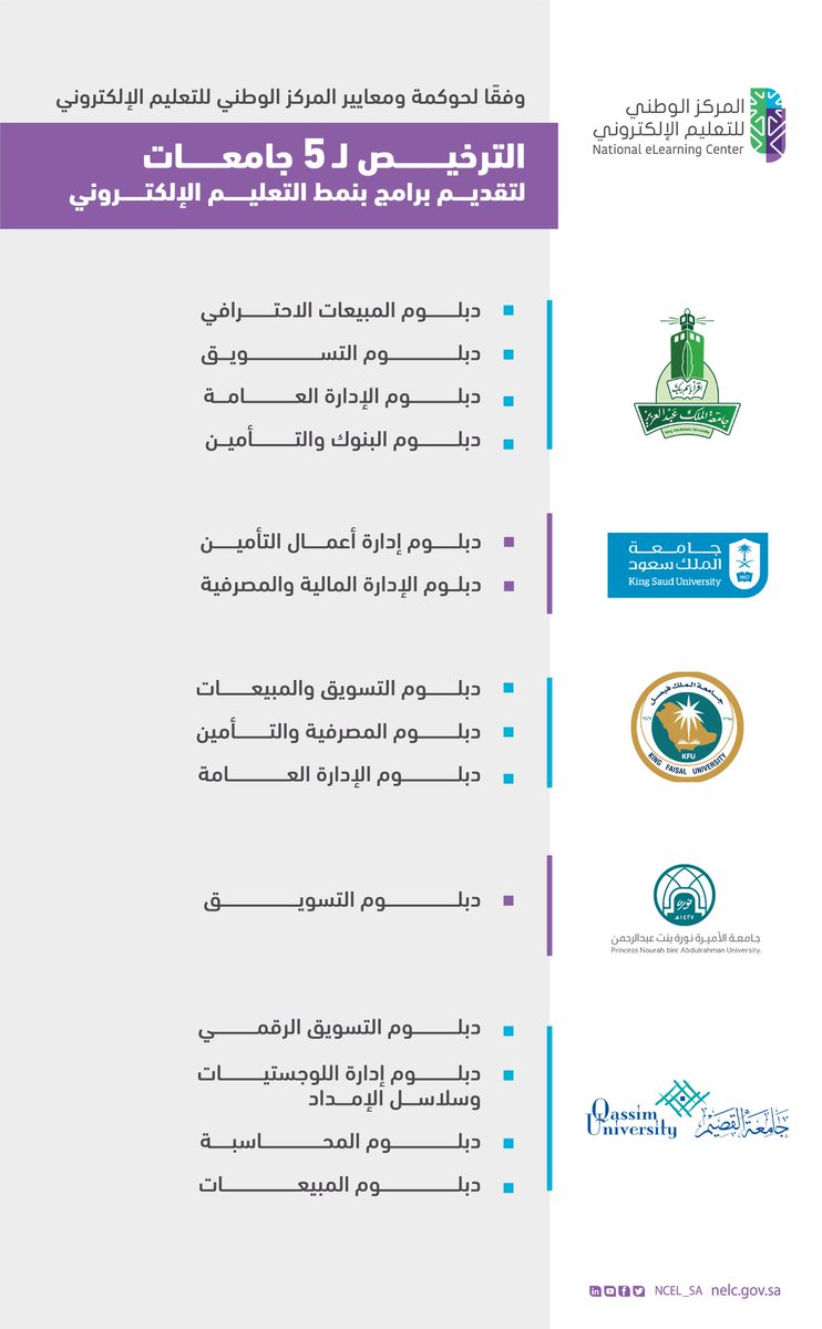 وظيفتك علينايعلن (المركز الوطني للتعليم الإلكتروني) عبر حسابه الرسمي على (تويتر) عن الجامعات والبرامج التدريبية للتعليم (عن بُعد) وفقاً لحوكمة ومعايير المركز، وذلك وفقاً للتفاصيل الآتية.