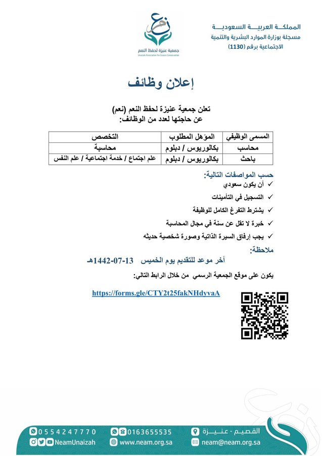 جمعية عنيزة لحفظ النعم تعلن عن توفر وظائف شاغرة لحملة الدبلوم فما فوق