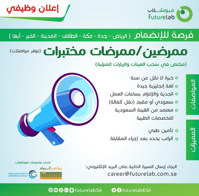 2021-02-21تعلن (مختبرات فيوتشرلاب الطبية) عبر حسابها الرسمي على (تويتر) عن توفر وظائف شاغرة بمسمى ( ممرضين/ممرضات مختبرات ) للعمل في (الرياض، جدة، مكة المكرمة، الطائف، المدينة المنورة، الخبر، أبها)، واشترطت ان يكون المتقدم سعودي الجنسية، وذلك وفقاً للتفاصيل والشروط الآتية.