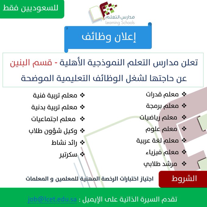 2021-02-21تعلن (مدارس التعلّم) عبر حسابها الرسمي على (تويتر) عن حاجتها لشغل وظائف تعليمية وإدارية - قسم البنين بشرط اجتياز اختبارات الرخصة المهنية للعمل في (الرياض)، واشترطت ان يكون المتقدم سعودي الجنسية، وذلك وفقاً للتفاصيل والشروط الآتية.