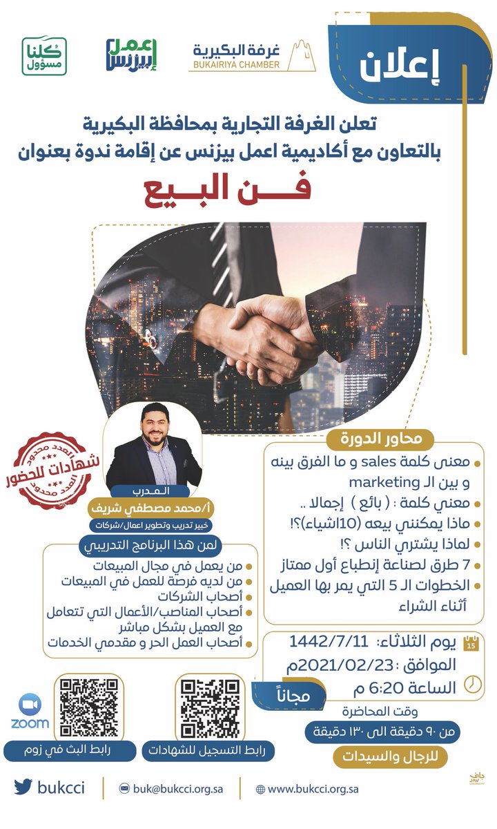 تعلن (غرفة البكيرية) عبر حسابها الرسمي على (تويتر) بالتعاون مع أكاديمية اعمل بيزنس عن إقامة دورة تدريبية مجانية عن بُعد بمجال فن البيع بمسمى ( فن البيع) تقام (عن بُعد)، واشترطت ان يكون المتقدم سعودي الجنسية، وذلك وفقاً للتفاصيل والشروط الآتية.
