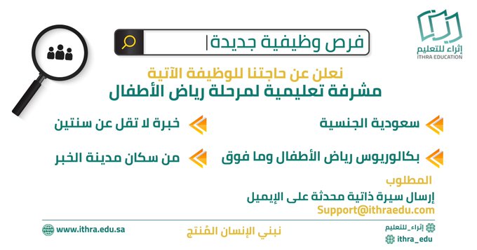 شركة إثراء للتعليمتعلن (مدارس إثراء للتعليم الأهلية بنات) عبر حسابها الرسمي على (تويتر) عن توفر وظائف شاغرة بمسمى ( مشرفة تعليمية لمرحلة رياض الأطفال) للعمل في (الخبر)، واشترطت ان يكون المتقدم سعودي الجنسية، وذلك وفقاً للتفاصيل والشروط الآتية.