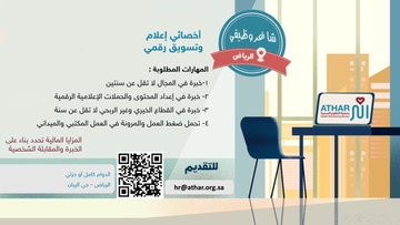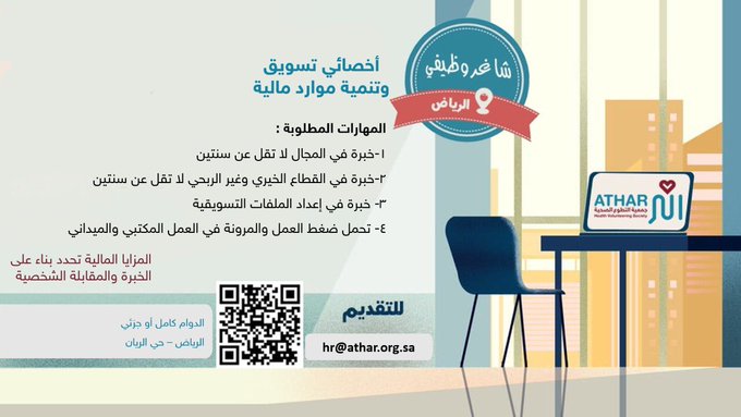 جمعية التطوع الصحية أثرتعلن (جمعية التطوع الصحية أثر) عبر حسابها الرسمي على (تويتر) عن توفر وظائف شاغرة للعمل في (الرياض)، واشترطت ان يكون المتقدم سعودي الجنسية، وذلك وفقاً للتفاصيل والشروط الآتية.