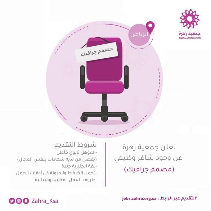 جمعية زهرة الخيرية الصحيةتعلن (جمعية زهرة الخيرية) عبر حسابها الرسمي على (تويتر) عن توفر وظائف شاغرة بمسمى ( مصمم جرافيك ) للعمل في (الرياض)، واشترطت ان يكون المتقدم سعودي الجنسية، وذلك وفقاً للتفاصيل والشروط الآتية.