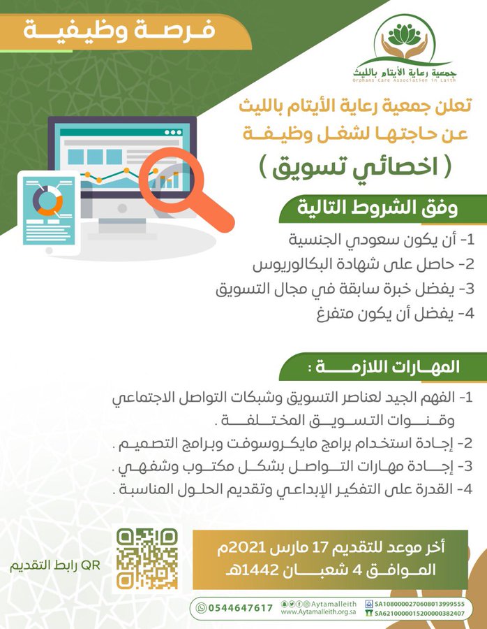 جمعية رعاية الأيتام بالليث توفر وظيفة بمجال التسويق لحملة البكالوريوس