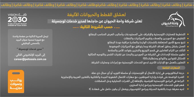 شركة واحة الحيوانتعلن (شركة واحة الحيوان) عبر حسابها الرسمي على (تويتر) عن توفر وظائف شاغرة بمسمى ( مدير خدمات لوجستية ) للعمل في (الرياض، جدة، الخبر)، واشترطت ان يكون المتقدم سعودي الجنسية، وذلك وفقاً للتفاصيل والشروط الآتية.