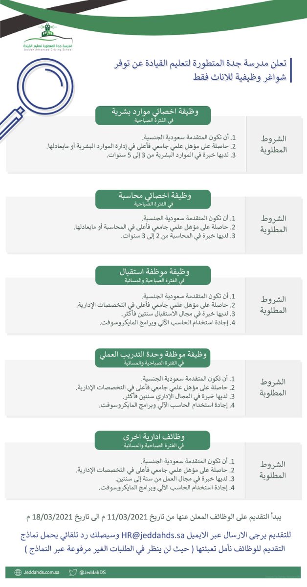 مدرسة جدة المتطورة لتعليم القيادة تعلن عن توفر وظائف إدارية لحملة البكالوريوس