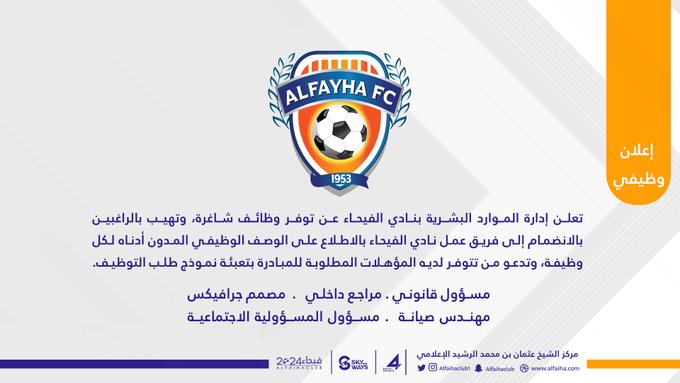 نادي الفيحاء السعودي يعلن عن توفر وظائف شاغرة لحملة الدبلوم فأعلى بالمجمعة