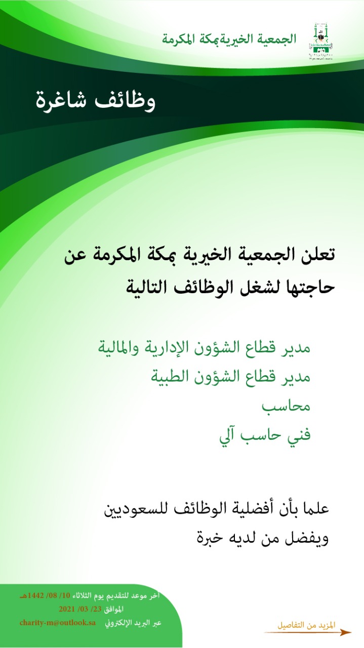 2021-03-19تعلن (الجمعية الخيرية بمكة) عبر حسابها الرسمي على (تويتر) عن توفر وظائف شاغرة للعمل في (مكة المكرمة)، واشترطت ان يكون المتقدم سعودي الجنسية، وذلك وفقاً للتفاصيل والشروط الآتية.
