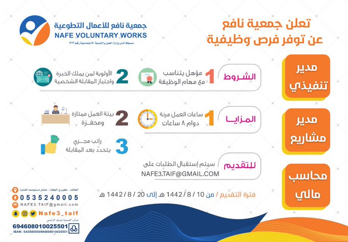 تعلن (جمعية نافع للأعمال التطوعية) عبر حسابها الرسمي على (تويتر) عن توفر وظائف شاغرة للعمل في (الطائف)، واشترطت ان يكون المتقدم سعودي الجنسية، وذلك وفقاً للتفاصيل والشروط الآتية.