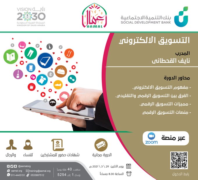 جمعية أعمال للتنمية الأسريةتعلن ( جمعية أعمال) عبر حسابها الرسمي على (تويتر) وبالتعاون مع بنك التنمية الإجتماعية عن تقديم دورة مجانية (عن بُعد) للجنسين، وذلك وفقاً للتفاصيل والشروط الآتية.