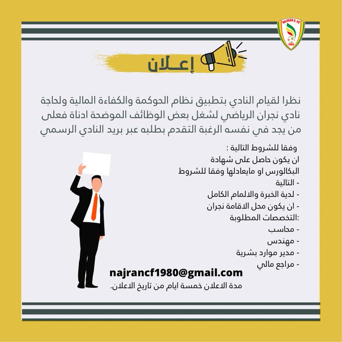 نادي نجران السعودي يعلن عن توفر وظائف لحملة البكالوريوس في عدة تخصصات