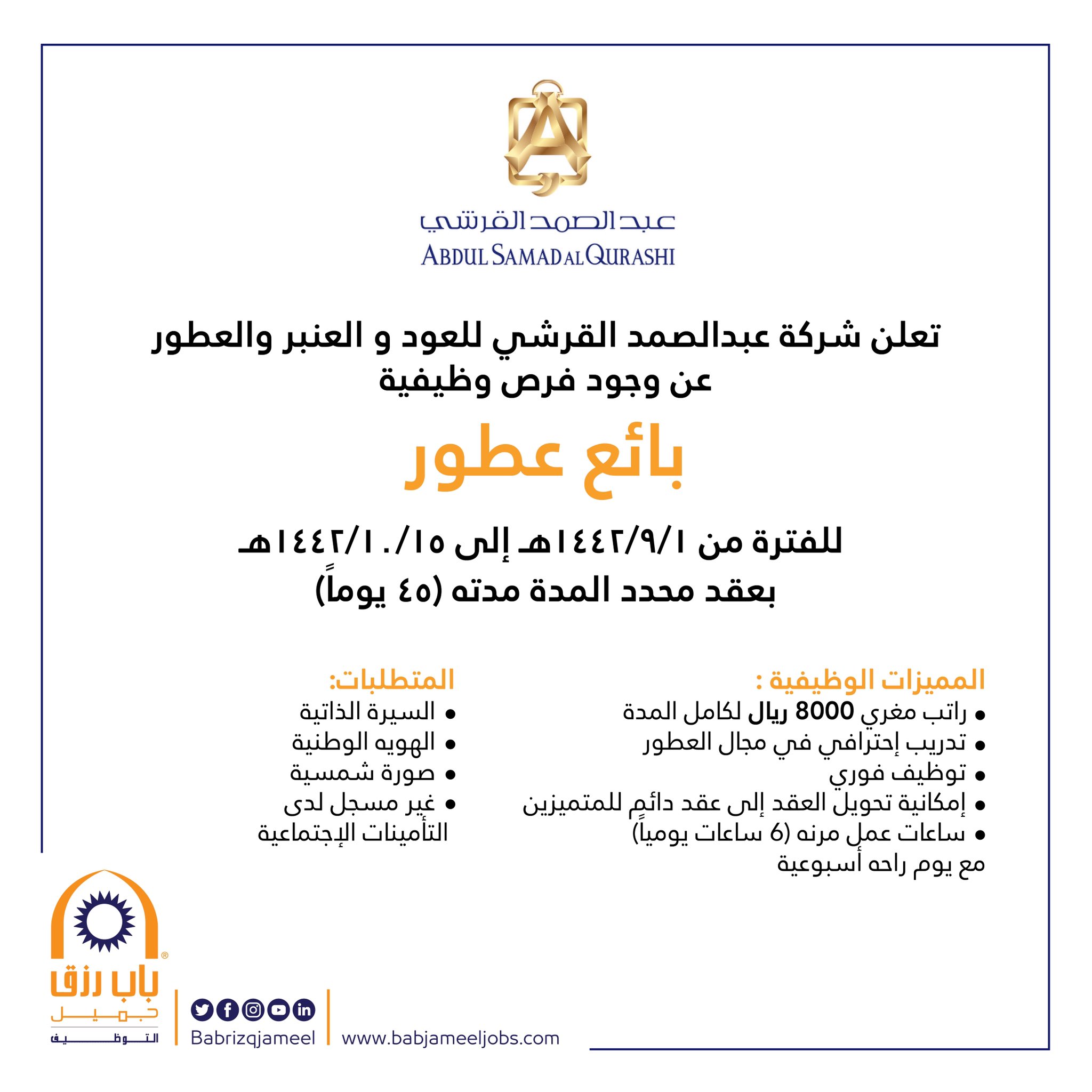 2021-04-04تعلن (شركة عبدالصمد القرشي) عبر موقع ( باب رزق جميل ) عن توفر وظائف شاغرة بمسمى ( بائع عطور ) للعمل في (الرياض، الدمام، الخبر، جدة، الطائف، بريدة، مكة المكرمة، المدينة المنورة، أبها)، واشترطت ان يكون المتقدم سعودي الجنسية، وذلك وفقاً للتفاصيل والشروط الآتية.