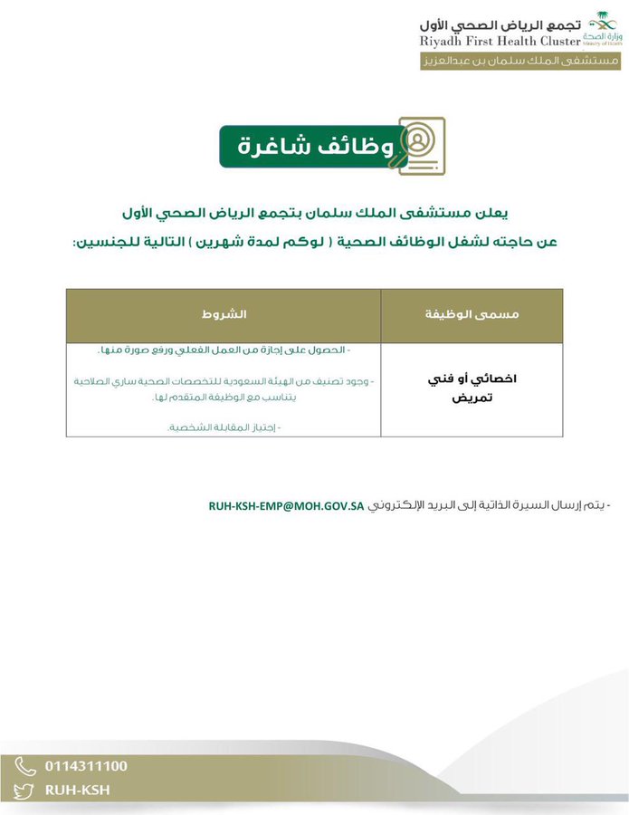 مستشفى الملك سلمانيعلن (مستشفى الملك سلمان بالرياض) التابع لتجمع الرياض الصحي الأول عن فتح باب التسجيل في التعاقد المؤقت ( لوكم ) وذلك للعمل بقسم خدمات التمريض للعام الحالي 1442هـ لمدة شهرين وذلك وفق التخصصات التالية.