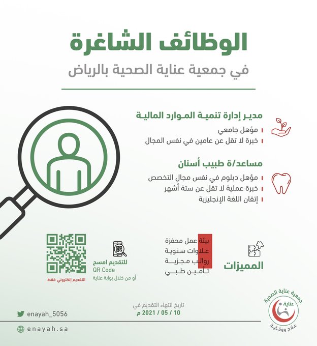 جمعية عناية الصحيةتعلن (جمعية عناية الصحية) عبر حسابها الرسمي على (تويتر) عن توفر وظائف شاغرة للعمل في (الرياض)، واشترطت ان يكون المتقدم سعودي الجنسية، وذلك وفقاً للتفاصيل والشروط الآتية.