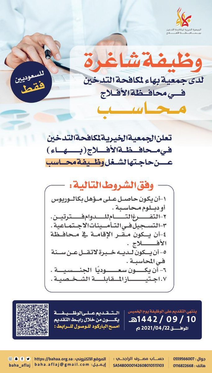 2021-04-19تعلن (جمعية بهاء لمكافحة التدخين) عبر حسابها الرسمي على (تويتر) عن توفر وظائف شاغرة بمسمى ( محاسب ) للعمل في (محافظة الأفلاج)، واشترطت ان يكون المتقدم سعودي الجنسية، وذلك وفقاً للتفاصيل والشروط الآتية.