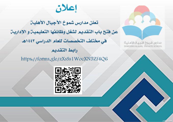 مدارس شموخ الأجيال الأهلية تعلن عن فتح باب التوظيف للوظائف التعليمية والإدارية لجميع التخصصات للعام 1443هـ