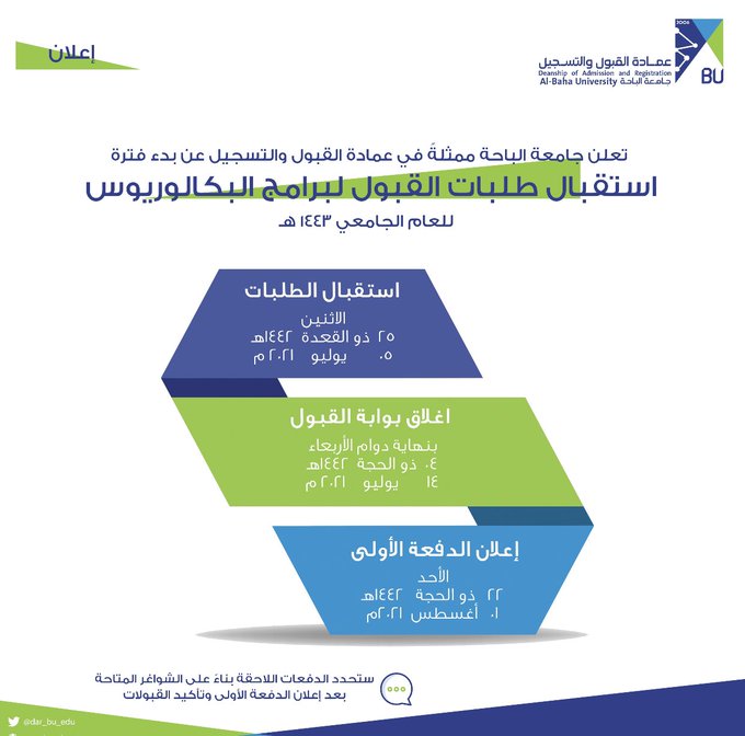 تعلن (جامعة الباحة) عبر حسابها الرسمي على (تويتر) عن موعد فتح باب القبول والتسجيل للعام الجامعي 1443هـ، وذلك وفقاً للتفاصيل والشروط الآتية.