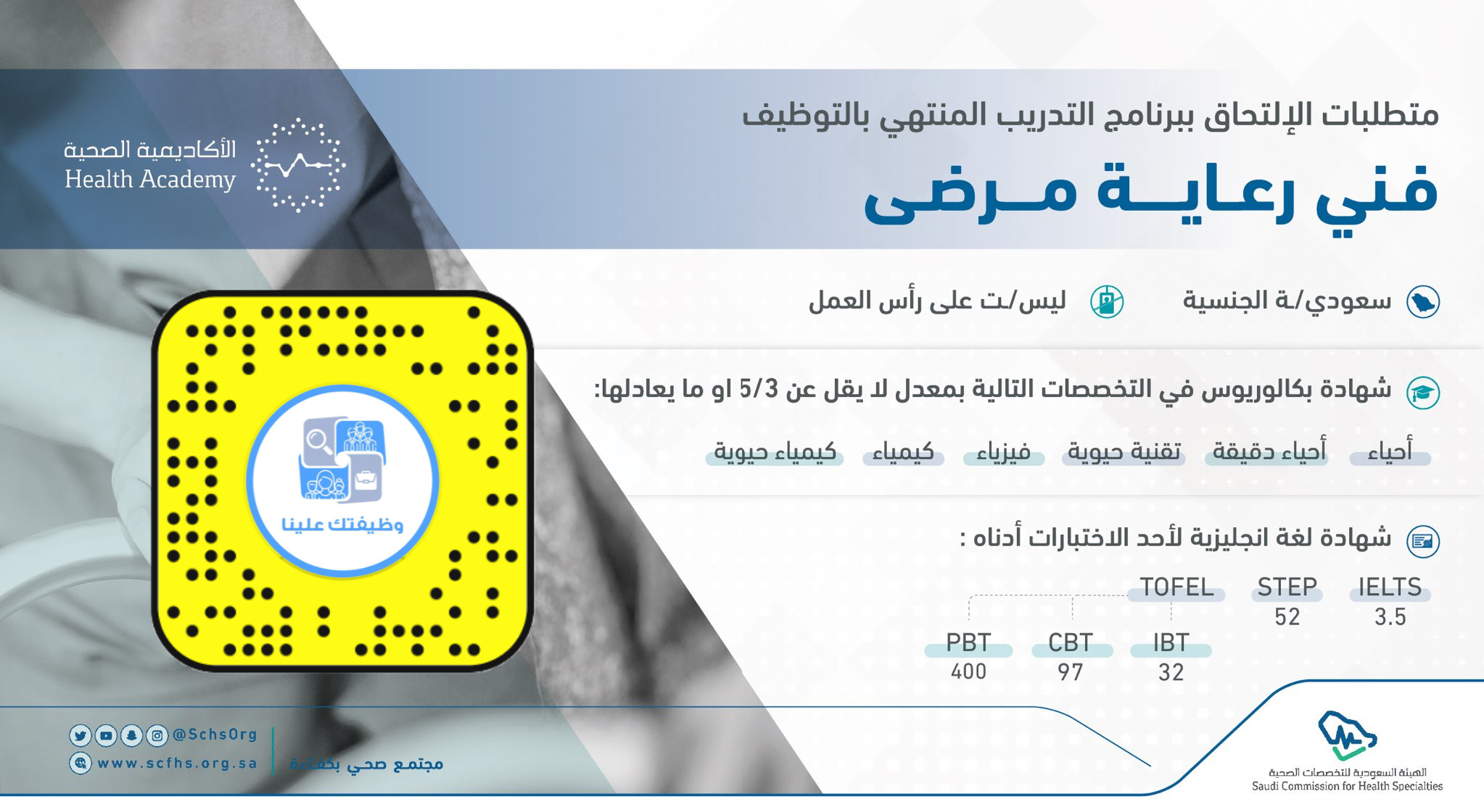 وظيفتك عليناتعلن (وزارة الموارد البشرية والتنمية الإجتماعية) بالتعاون مع (هيئة التخصصات الصحية) عن فتح باب القبول والتسجيل في (برنامج فني رعاية مرضى) للجنسين المنتهي بالتوظيف، وذلك وفقاً للتفاصيل الآتية.
