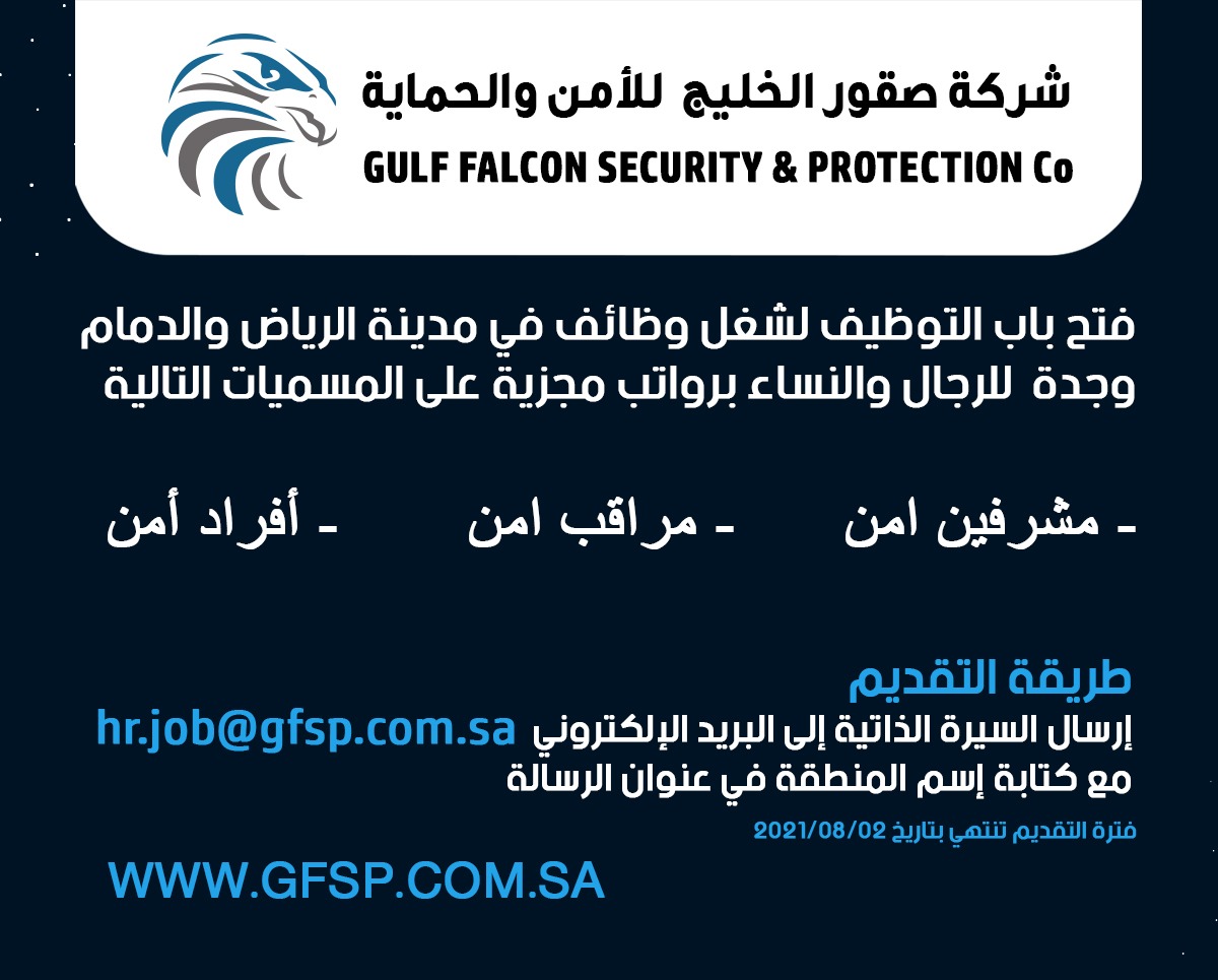 شركة صقور الخليج للحراسات الأمنيةتعلن (شركة صقور الخليج للحراسات الأمنية) عبر حسابها الرسمي على (تويتر) عن فتح باب التوظيف للوظائف الأمنية لحملة الثانوية فأعلى ولا يشترط وجود خبرة سابقة للعمل بمسمى ( مشرفين أمن، مراقبين أمن، أفراد أمن) في (الرياض، الدمام، جدة)، واشترطت ان يكون المتقدم سعودي الجنسية، وذلك وفقاً للتفاصيل والشروط الآتية.