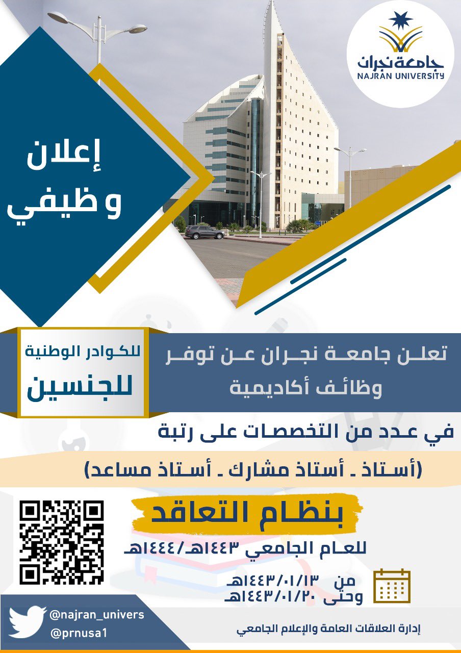جامعة نجران تعلن عن توفر وظائف أكاديمية للجنسين بنظام التعاقد بعدة تخصصات للعام 1443هـ