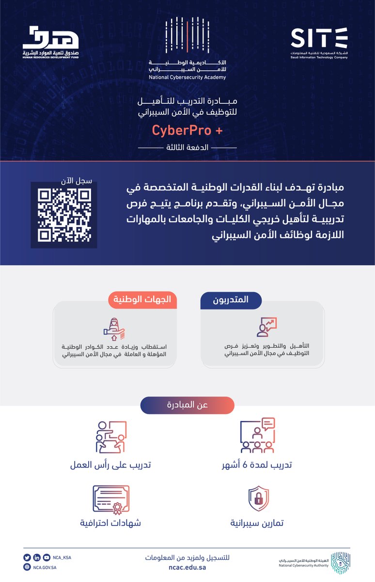 وظيفتك عليناتعلن (الهيئة الوطنية للأمن السيبراني) بالتعاون مع صندوق تنمية الموارد البشرية "صندوق الموارد البشرية - هدف" عن إطلاق برنامج التدريب للتأهيل للتوظيف في الأمن السيبراني (CyberPro+) الدفعة الثالثة, الذي يهدف لتأهيل خريجي الجامعات والكليات، في مجالات الأمن السيبراني والمجالات ذات العلاقة، بالمهارات اللازمة لوظائف الأمن السيبراني من خلال برنامج تدريبي مكثف يتم تنفيذه بالشراكة مع الشركة السعودية لتقنية المعلومات "سايت"، وذلك وفق التفاصيل الآتية.