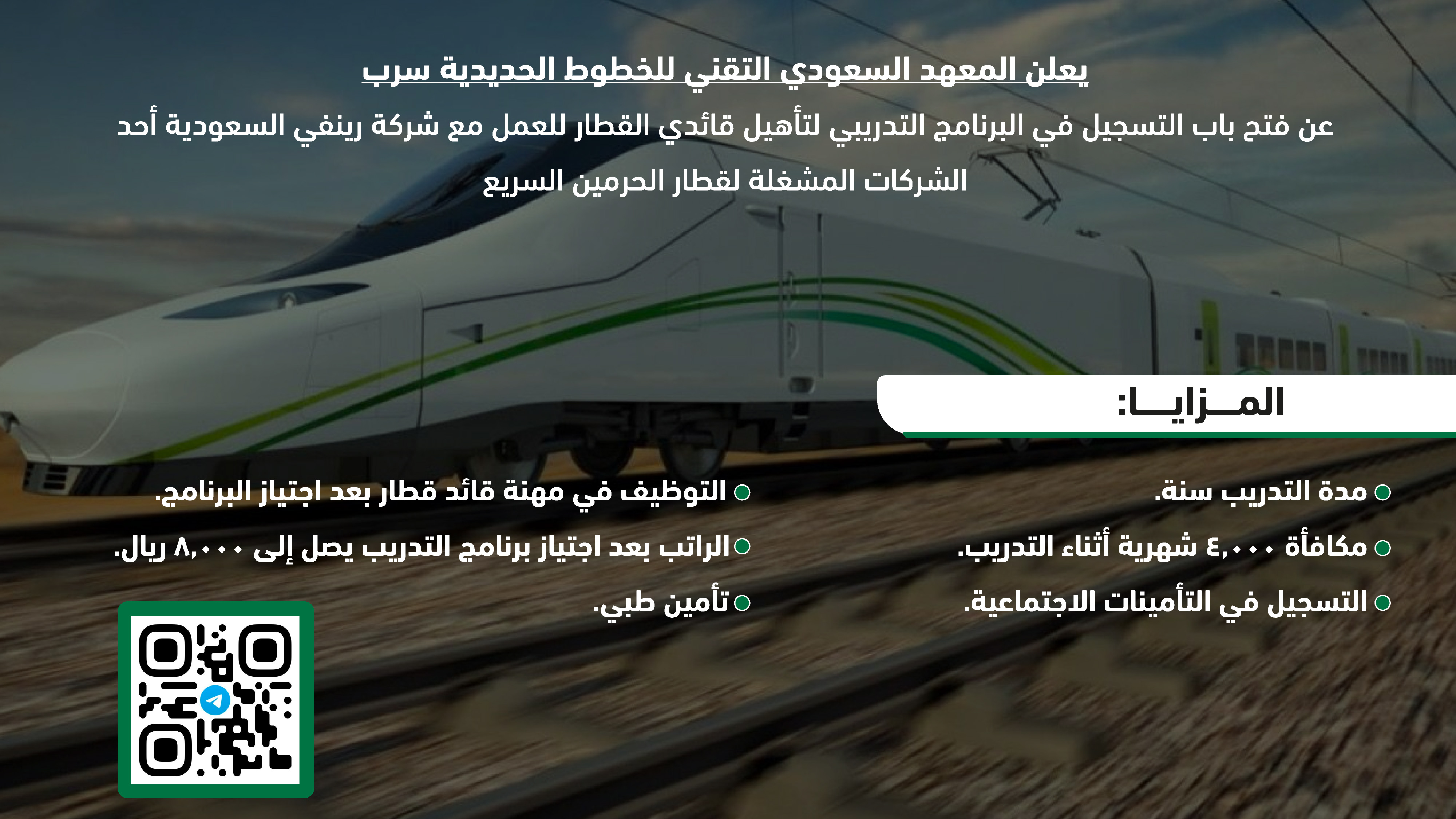 يعلن المعهد السعودي التقني للخطوط الحديدية سرب ، عن فتح باب التسجيل في البرنامج التدريبي لتأهيل قائدي القطار للعمل مع شركة رينفي السعودية أحد الشركات المشغلة لقطار الحرمين السريع، وذلك من خلال التفاصيل الآتية.